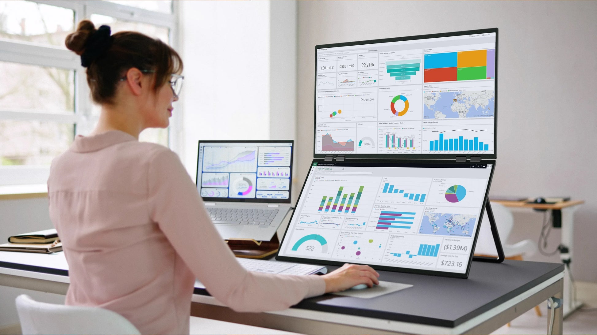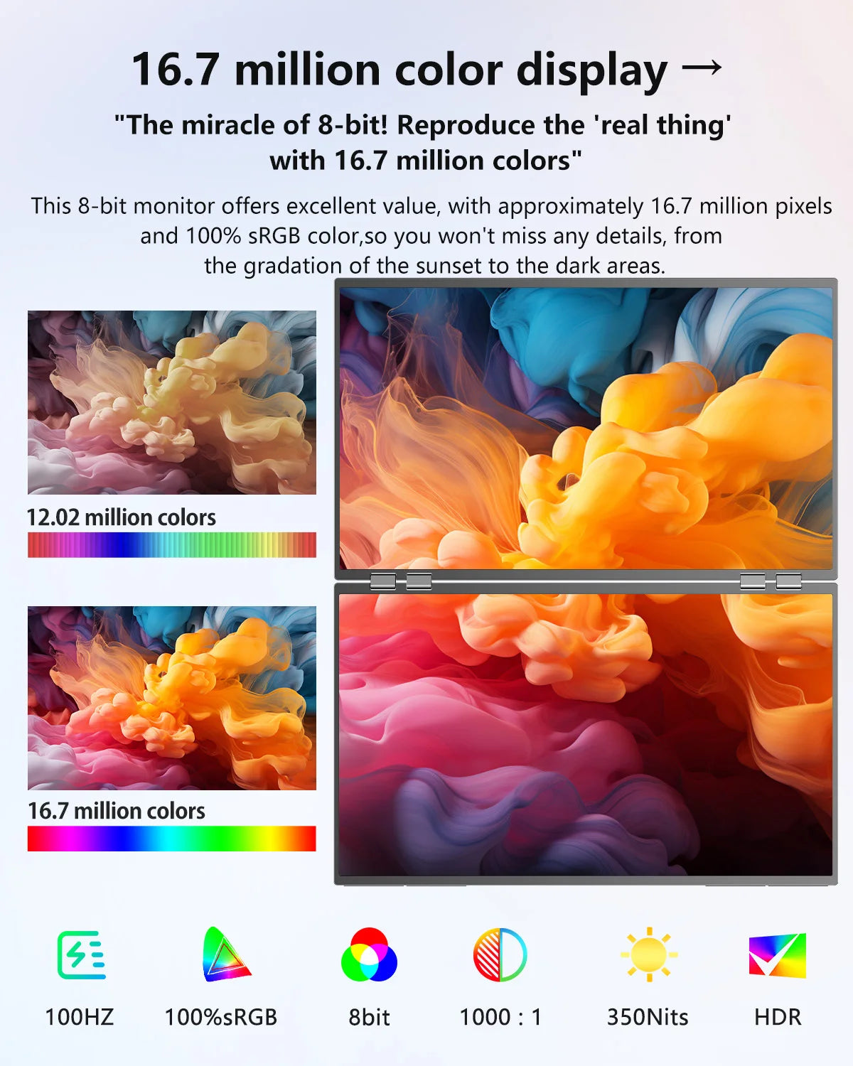 The 360-degree folding design of the 23.8 inch dual screen display gives users a more flexible operating experience. The two displays are connected by precision hinges, which can be fully folded, unfolded, flipped and other forms to meet the needs of different usage scenarios. Users can also use the folding angle adjustment to create a variety of application experiences such as book-like reading, presentation sharing, etc.